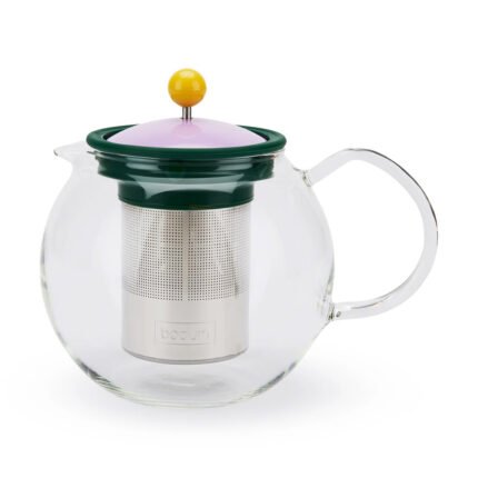 La Bodum Assam es la tetera de Bodum para quienes ya saben lo que quieren. Vidrio borosilicato resistente al calor, émbolo de acero inoxidable con malla fina que detiene la infusión en el momento exacto, y ese lenguaje formal escandinavo-danés que Bodum lleva décadas perfeccionando: sin adornos, todo función visible. La palanca baja cuando el té llegó a su punto; el vidrio muestra el color mientras se desarrolla.