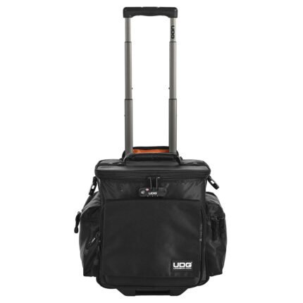 UDG Ultimate SlingBag Trolley DeLuxe MK2 es la versión para viajes serios de la SlingBag: misma filosofía de protección y organización, con capacidad para hasta sesenta vinilos de doce pulgadas o un controlador MIDI con accesorios, y un compartimento adicional para laptop de hasta 13 pulgadas. Lo que lo distingue es el sistema de ruedas en línea con rodamientos ABEC 7 —la misma especificación que los patines de competición—, el mango telescópico de tres etapas, y la cerradura de combinación TSA integrada para viajes en avión. Nylon 420D resistente al agua, paredes acolchadas, correa de hombro desmontable para cuando las ruedas no son opción. El compañero de la SlingBag para quien viaja con su colección en serio.
